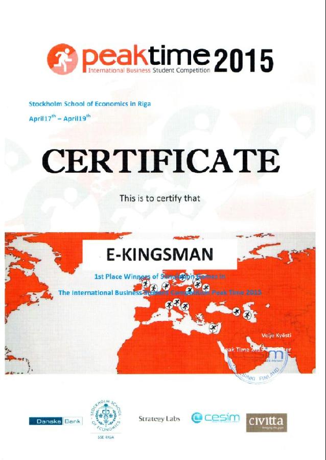 2015年4月20日,第十六届国际商业模拟竞赛“PEAKTIME”全球总决赛落下帷幕,公司代表队E-KINGSMAN荣获商业模拟全球第1名、综合总成绩亚洲第2名、全球第8名的优异成绩。继2014年公司学子首次走出国门、参加国际商科类竞赛获得商业模拟全球第1名的基础上,今年,公司再次取得国际商科竞赛的顶尖荣誉,这充分表明公司实施以“四模块”为框架的实践教学取得了重大的成果,同时也标志着公司创新创业教育工作取得了显著的成效。